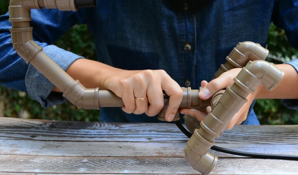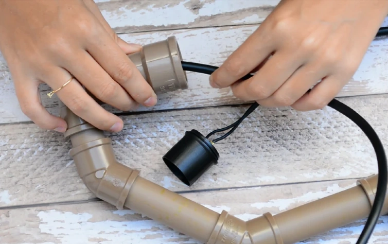 Passo 4: Agora, inicie a montagem da parte superior da luminária. Una o conector luva ao cano de 2cm, e depois una esse ao joelho de 90°. Utilize outro cano de 2cm para uni-lo ao joelho de 45°.