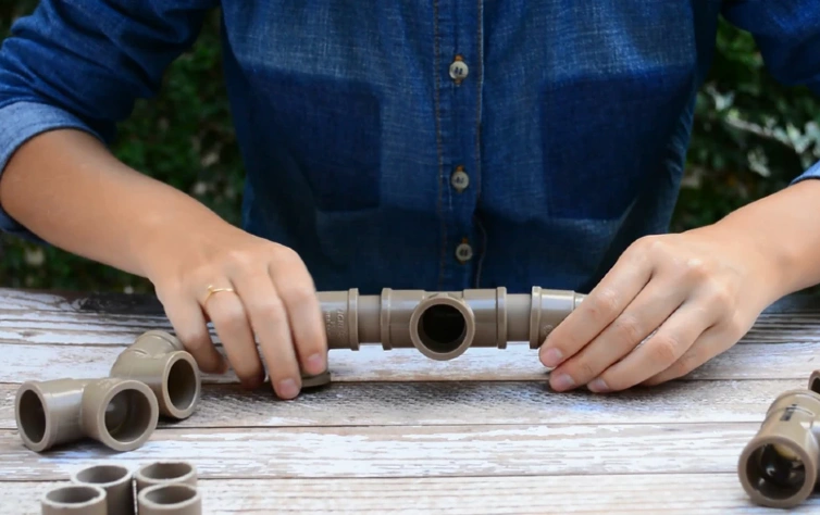 Passo 2: Iniciando pela base, encaixe os 4 joelhos de 90° aos 4 canos de 2cm. Então, una duas partes com um conector T e e as outras duas partes com outro conector T. Use outros 2 canos de 2cm para unir os pés a outro conector T.