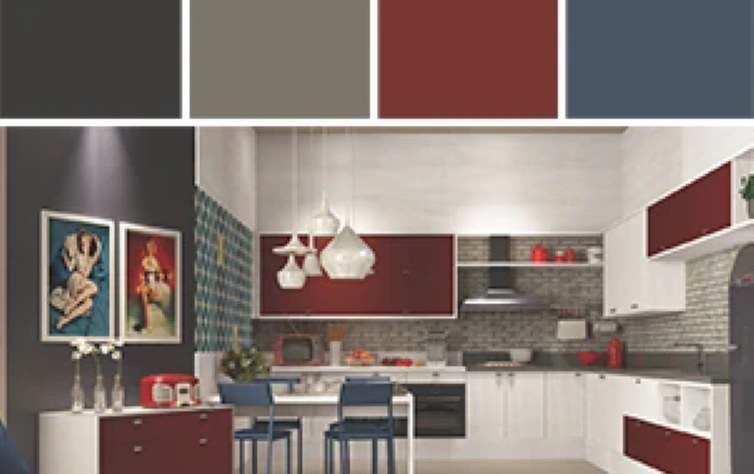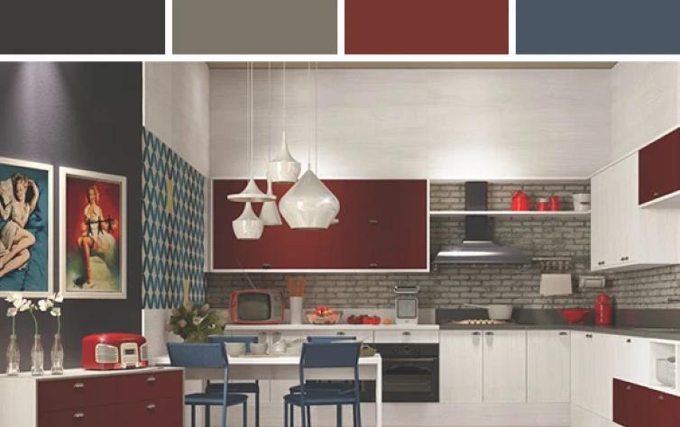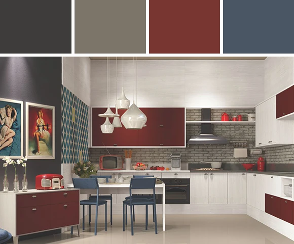 Inspiração de outras décadas, essa cozinha faz uma releitura de um ambiente moderno pela funcionalidade, mas com uma cara retrô. Os tons mais vibrantes, como o bordô e o azul-petróleo, reforçam essa tendência na mobília e nas paredes do cômodo. O branco predomina, mas ganha destaque com as portas e as gavetas coloridas. Ah! O papel de parede também tem importância já que essa textura de tijolos lembra o material de casas mais antigas.